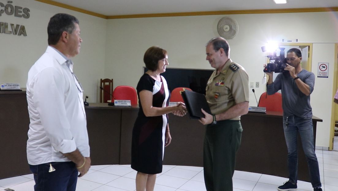 A vereadora Dóris Sguizardi recebeu do coronel Lajoia o diploma de Amigo da 9ª Região Militar pelos serviços relevantes em prol do interesse e do bom nome do Exército. A honraria também foi entregue pelos vereadores Dóris, Denny Serafini, Lika e Ruam Batista ao secretário adjunto municipal de Administração, Paulo Gomes Barbosa.